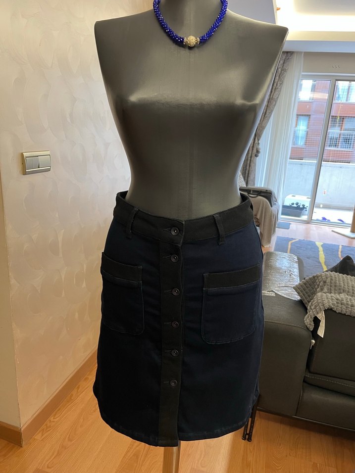 Siyah denimden yapılmış, kemerli ve önden düğmeli, düzenli kesimli midi etek. Günlük kullanıma uygun gotik stil. Likralıdır 38 bedene uygundur