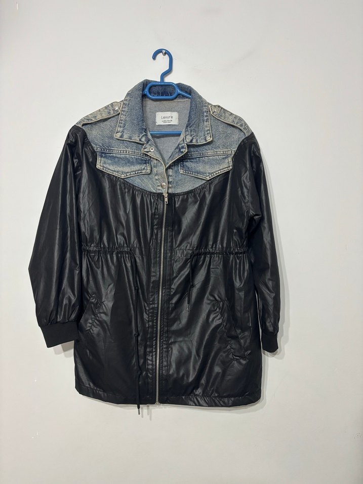 Kot yaka ve omuz detaylı siyah ceket, belden kemerli ve bol kesimdir. Strappy kollu, midi boyda, sokak stilini yansıtır.
