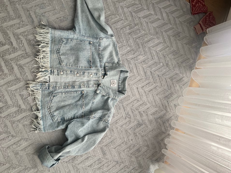 Geniş kesim, düğmeli denim ceket. Çentikli yaka ve uzun kollu, gündelik sokak stili için uygun.