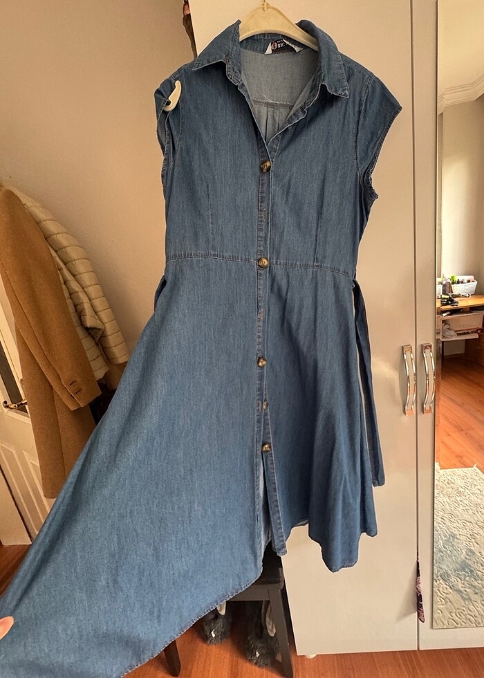 Belden oturtmalı kot ince kısa kollu elbisedir