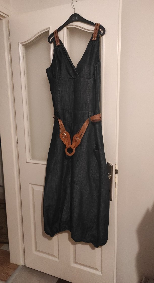 denim elbise, askılı ve belden kemerli olup, kahverengi detaylarla bohem vintage tarzını yansıtıyor. Uzun ve kolsuzdur, günlük kullanıma uygundur.