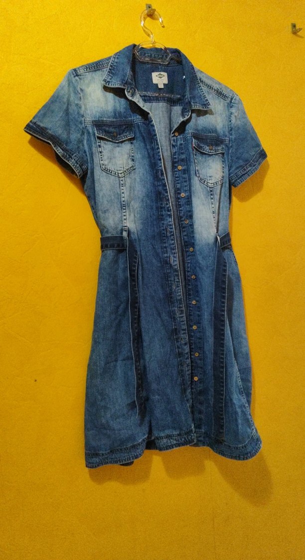 Bu kemerli, fitted kesim mavi denim midi elbise kısa kollu ve yanlarında cepleri var üstte harika duruşu olan bir elbise çok giyilmedi L beden Lee Cooper marka