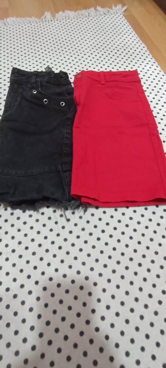 Canlı kırmızı ve siyah renklerde, düğmeli ve ince kot kumaştan yapılmış kızlar için kısa etek.Minimalist tasarım, sokak modasına uygun. Temiz kusuru yok. biri koton marka diğeri LCW