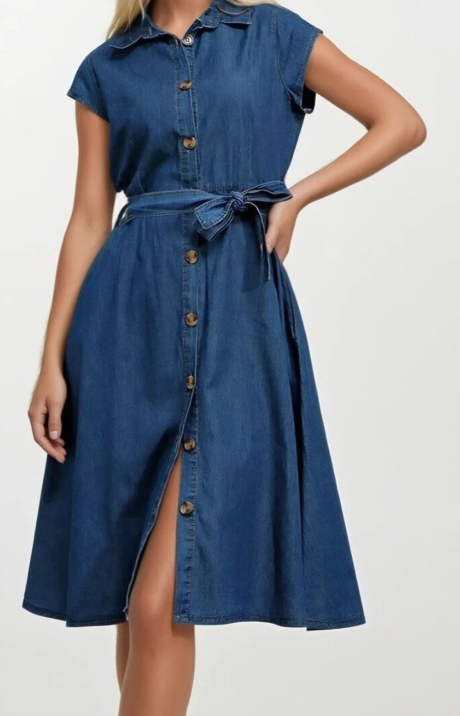Kadın denim kısa kollu boydan düğmeli beli kuşaklı kot gömlek elbise