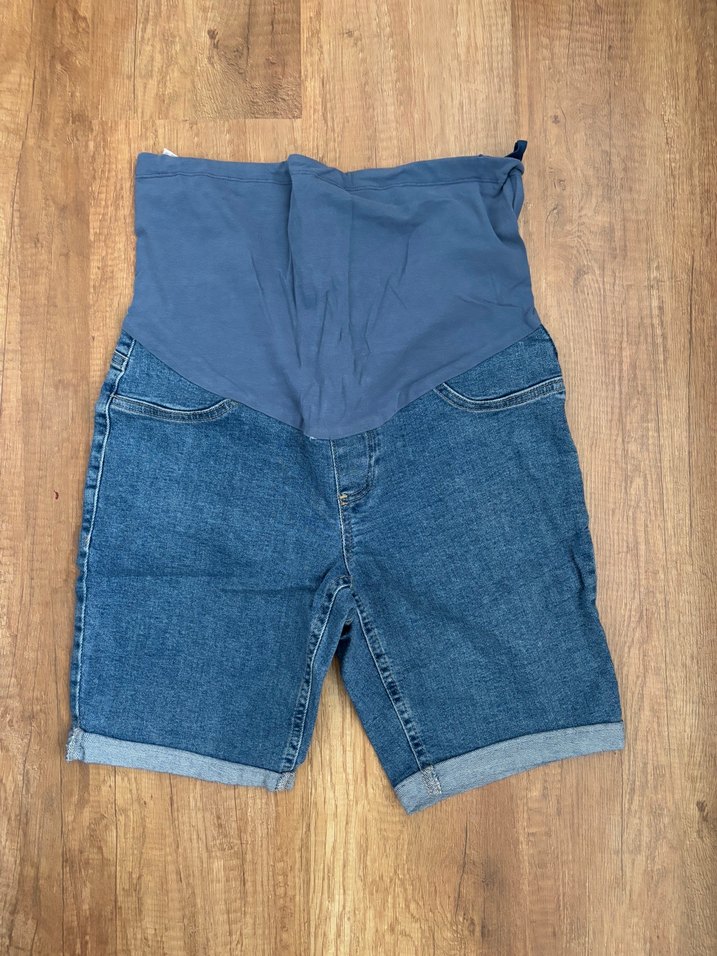 Kemerli ve gri esnek panel detaylı, rahat kesim kot hamile midi şort. Sokak stiline uygun, açık hava kullanımı için idealdir. Çok çok az giyildi