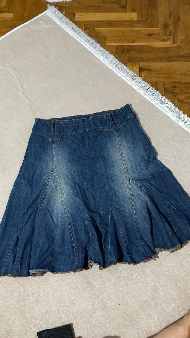 Kot kumaştan, bol kesim, volan detaylı hamile midi etek. Mavi-gri tonlarda, günlük kullanıma uygun rahat stil.