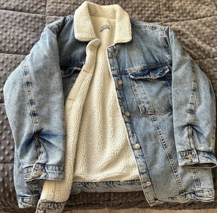 kürklü iç detaylı, salaş kesim uzun kollu kadın denim ceket. Orta boy uzunlukta, günlük rahat stil için uygundur.