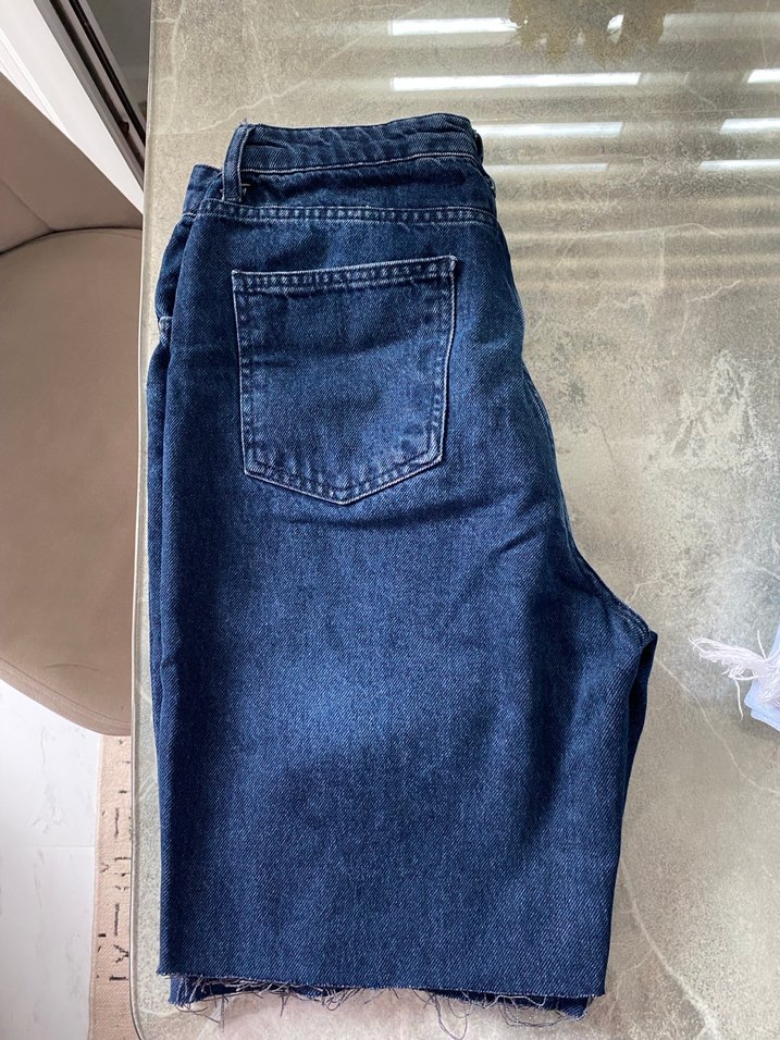 Trendyolmilla anne kot şortu. Desensiz, mavi renkte, günlük kullanıma uygun rahat model.