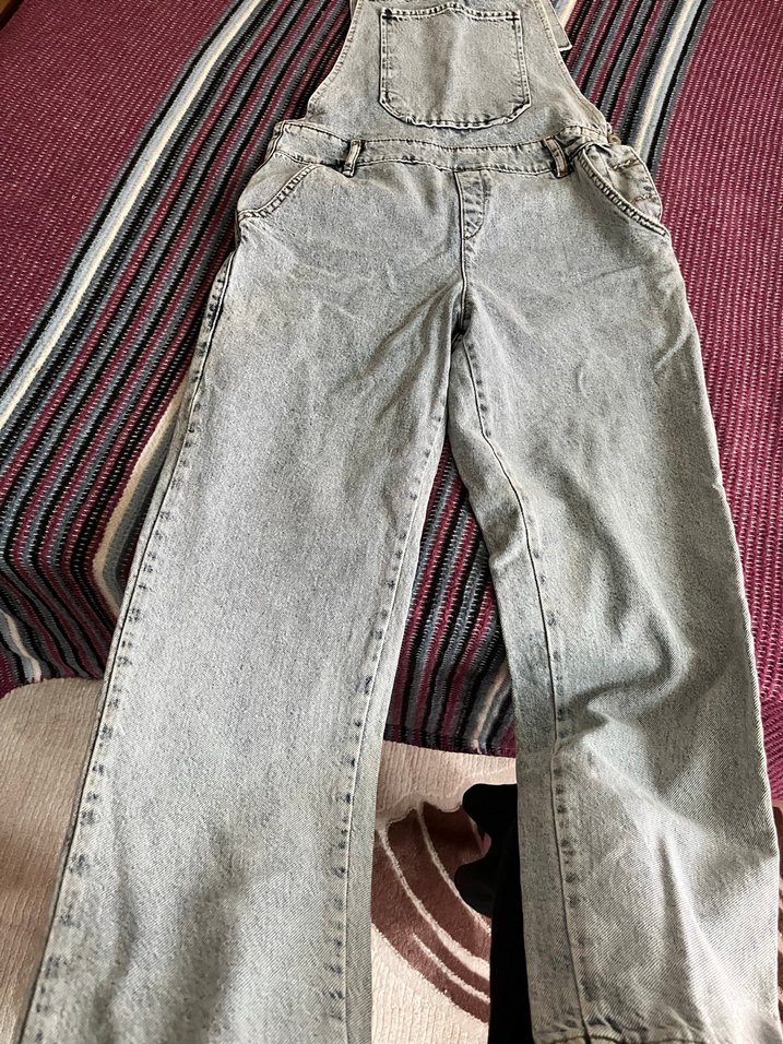 Kot bağcıklı askılı ve batik desenli bol kesim kadın denim tulum, günlük kullanıma uygun.