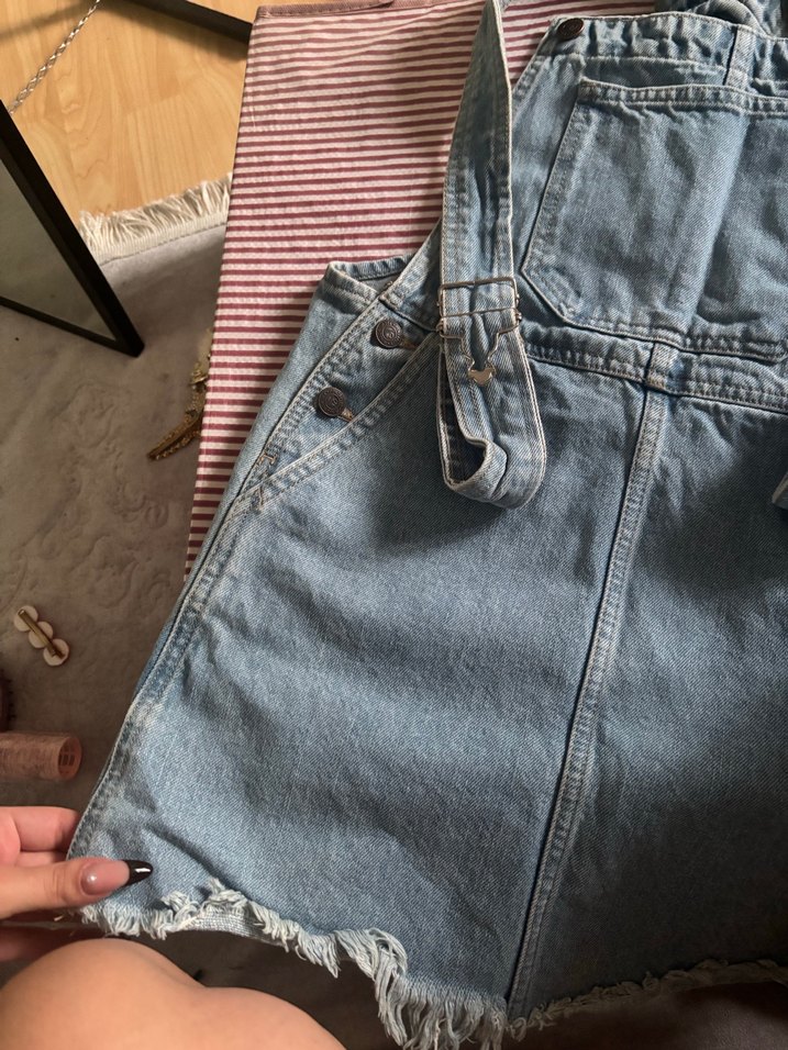 Bol kesim, tokalı askılı kot midi salopet, günlük kullanım için salaş sokak stili sunar.