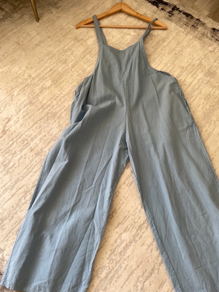 Gri renkte, keten kumaştan, bol kesim uzun tulum. Askılı ve straplez yaka detaylarıyla rahat ve bohem bir tarz sunar.