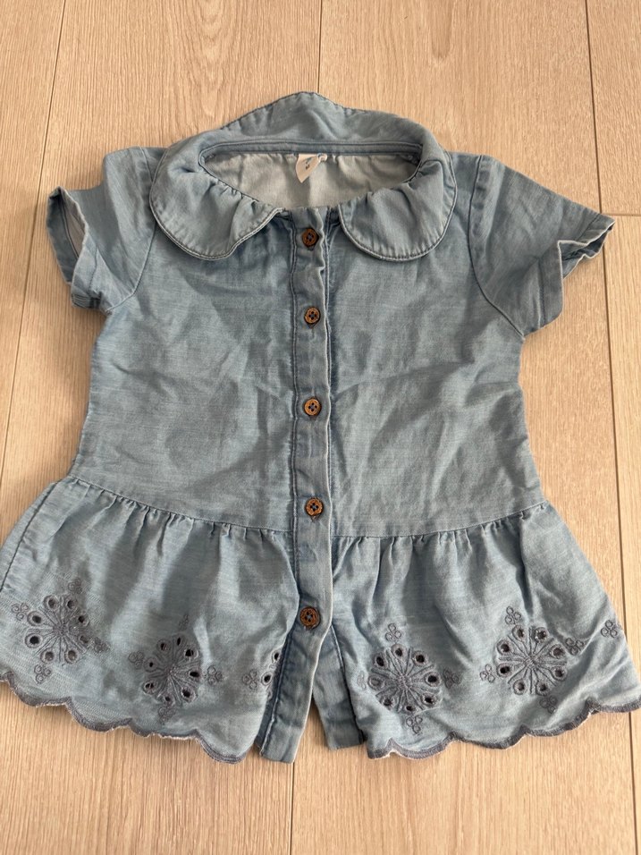 Yumuşak denim kumaştan, kısa kollu, yakalı ve düğmeli, nakış detaylı bol kesim kız elbisesi.