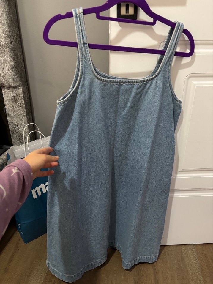 Kot kumaştan yapılmış, askısız ve salaş kesimli midi hamile elbisesi. Günlük kullanım için rahat ve şık bir seçenek.