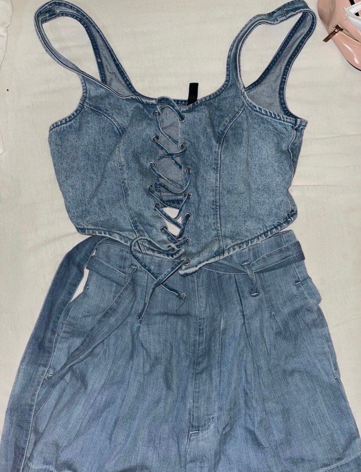 Kot kumaştan yapılmış, bel detayı ve bağcıklı ön kısmı olan, askılı ve straplez kesim mini tulum. Günlük kullanıma uygun, rahat ve şık.
