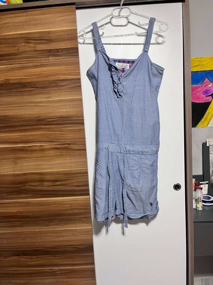 Mavi kot kumaştan, V yaka ve askılı kısa tulum. Bel detaylı, rahat kesim, günlük ve trend sokak stili için uygundur.