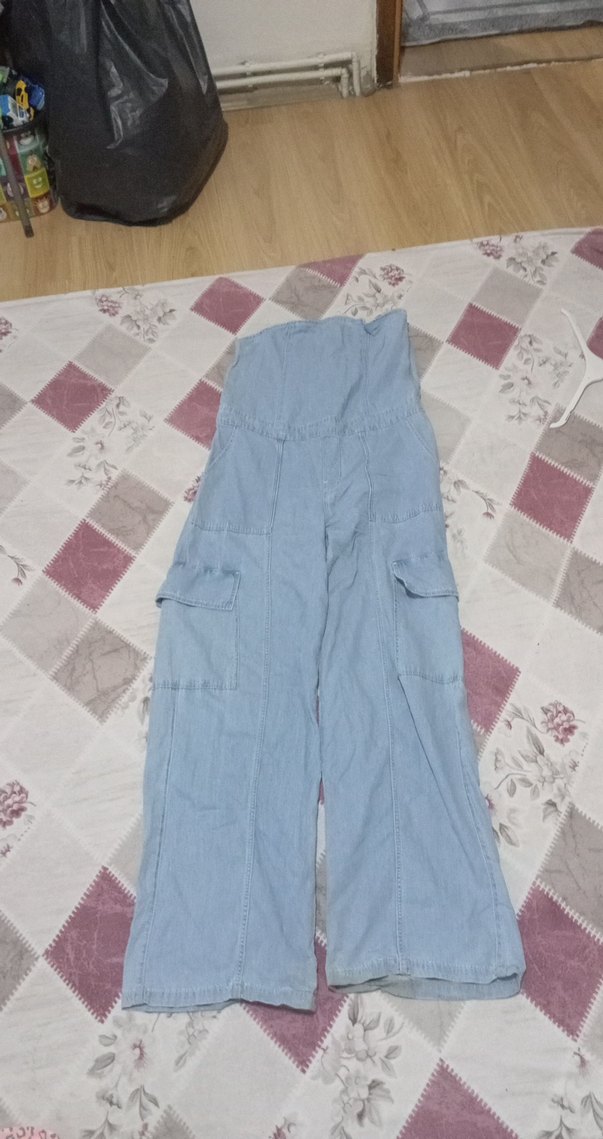 Askısız, bol kesim kot hamile tulum, pastel mavi renkte, kemerli ve uzun boylu. Rahat günlük kullanım için uygundur.
