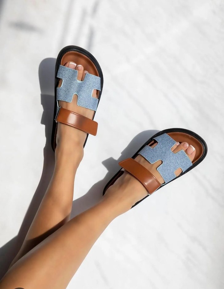 Günlük kullanıma uygun, kot kumaş ve kahverengi tokalı kayışlı terlik. Desensiz tasarımı şık bir görünüm sunar. marka temsili