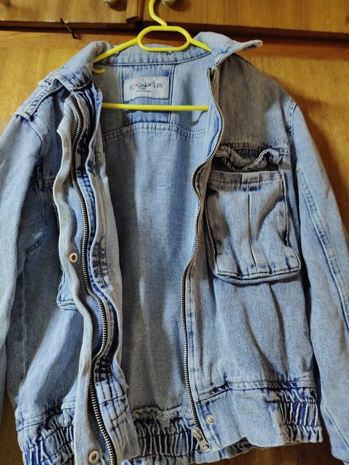 Gri-mavi tonlarda, fermuarlı, kısa kesim bol paça denim ceket. Uzun kollu ve yakası notched lapel modeldir. Günlük kullanıma uygundur.