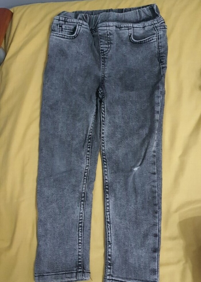 Gri kot 4/5 yaş 104/110 cm Sol dizde yırtılmaz mevcut. Ister yırtık modası tarzinda da giyilebilr, ister yama yada arma dikilerek giyilebilir. Baska hicbir sıkınti yok
