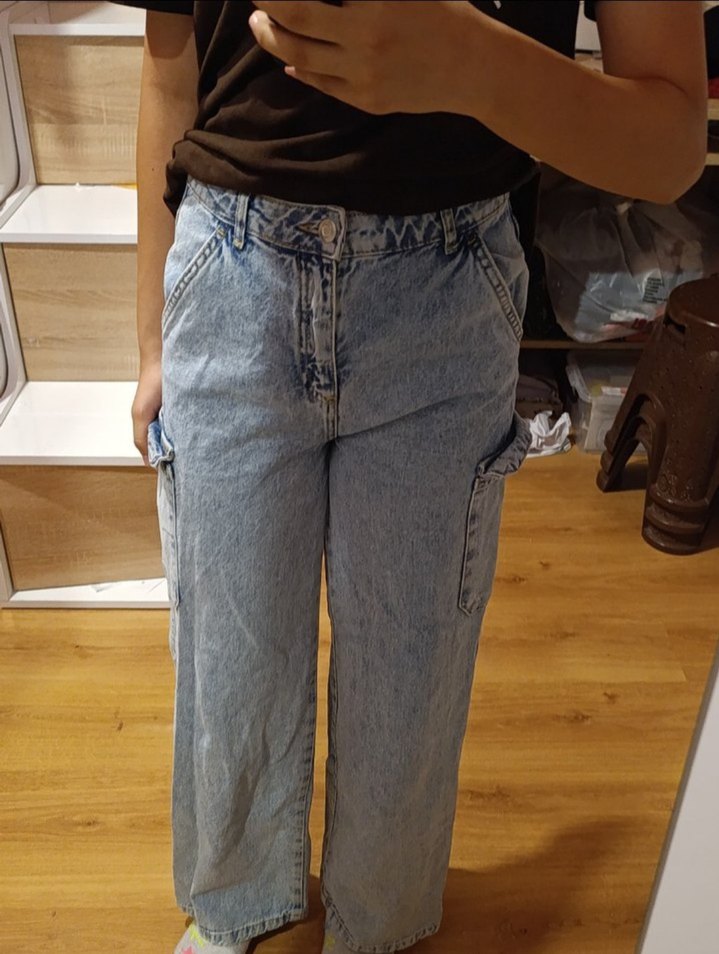 Gri renkte, bol kesim, midi boy, tokalı detaylı denim kadın jean. Günlük ve sokak stiline uygun, rahat ve desensiz tasarım.