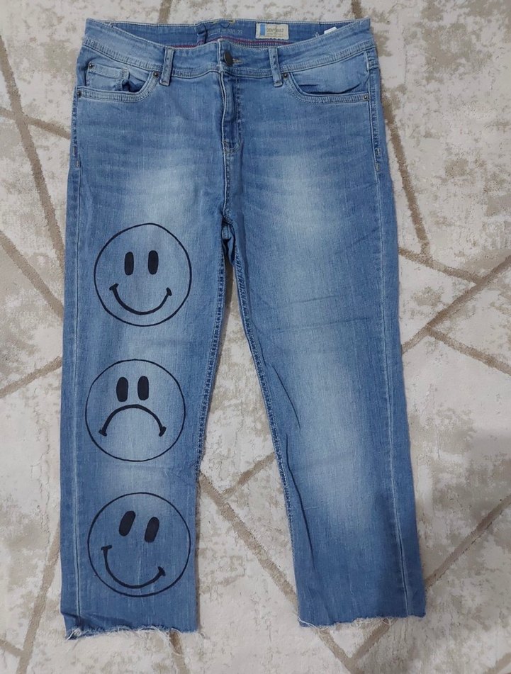 Bol kesim kadın mavi denim jean, bir bacakta gülen yüz baskıları ve yıpranmış etek ucu detaylarıyla günlük sokak stili için uygundur.