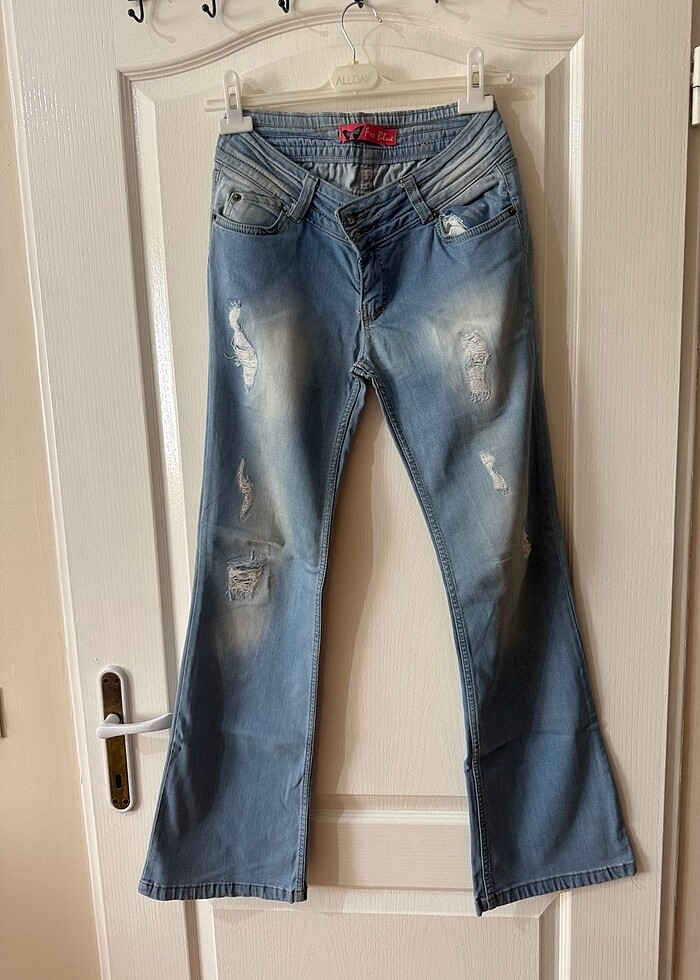 Yırtık ama iç göstermez kot pantolon, boyu ağından 79 cm, beli 38cm. Bedeni 28