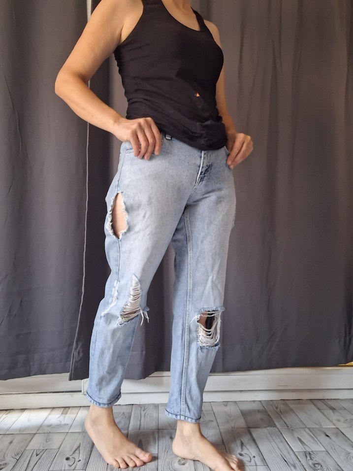 Gri renkte, yırtık detaylı, loose fit ve midi boy kot pantolon. Rahat ve şık, günlük sokak stili için uygundur.