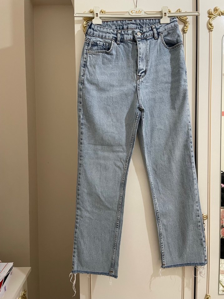 Düz model, midi boy, gri mavi kot pantolon. Sokuk veya yırtık sorunu yok. Rahat ve günlük stil için uygun, kot kumaştan üretilmiştir.