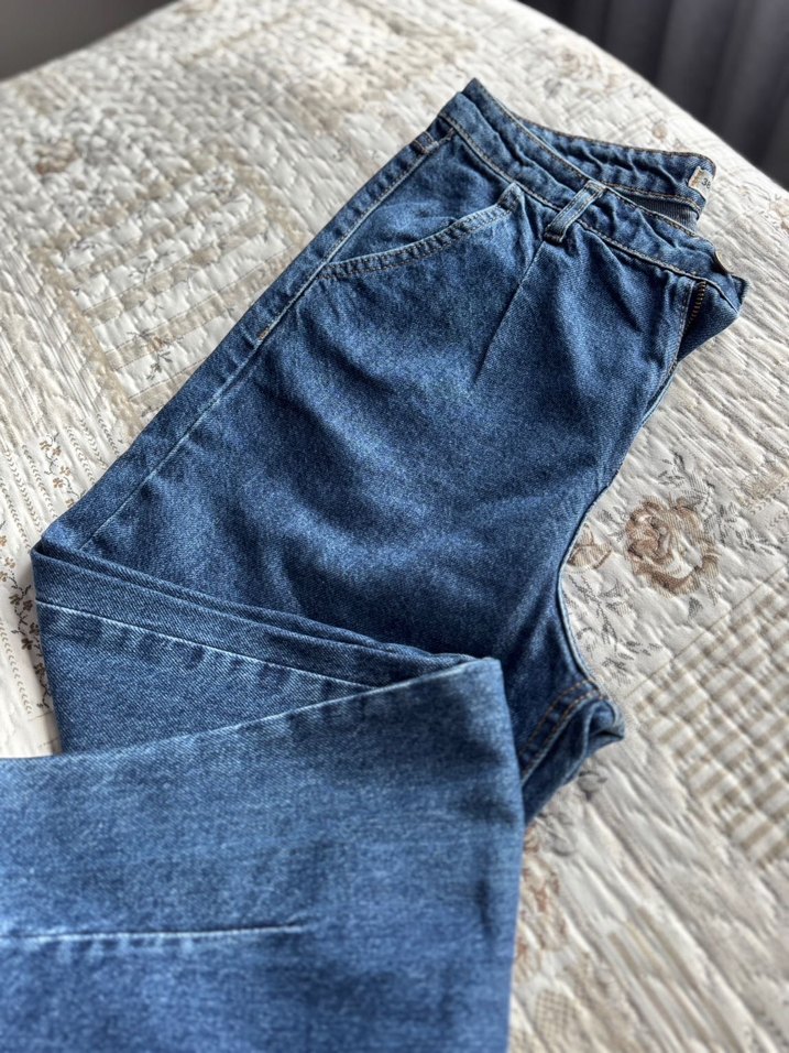 Mavi renkli, bol kesim ( mom jean) ve kemerli bel özellikli midi uzunlukta denim pantolon. Sokak stiline uygun, günlük kullanıma ideal, desensiz tasarım.