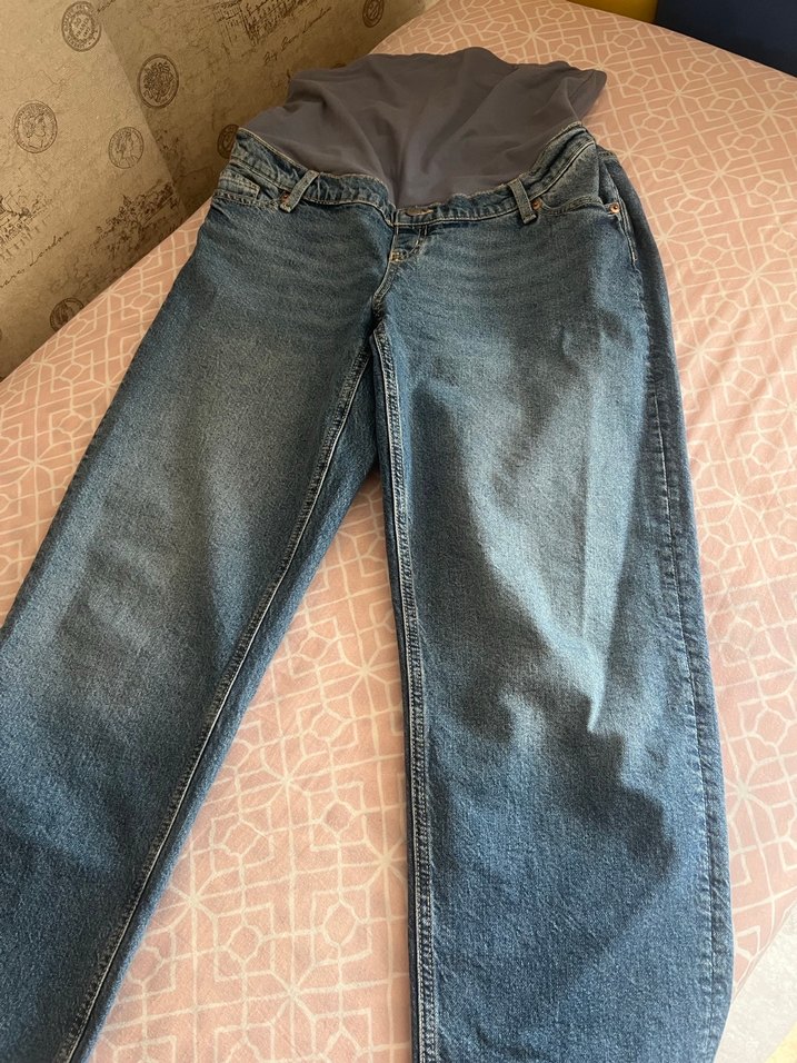 Gri renkte, bol kesim ve esnek bel bantlı hamile kot pantolon. Günlük kullanıma uygun, midi boy ve tokalı detaylı rahat kot pantolon.