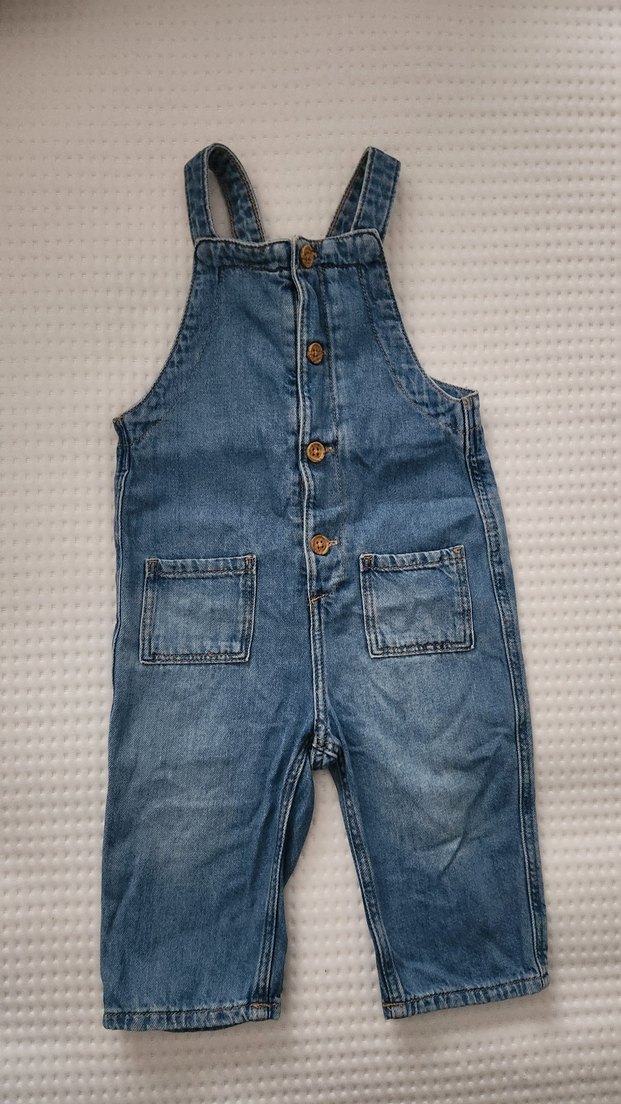Düğmeli ön cep detaylı, regular fit, mavi kot kumaştan unisex bebek tulumu. Kolsuz ve desensiz, street wear tarzında tasarlanmıştır.