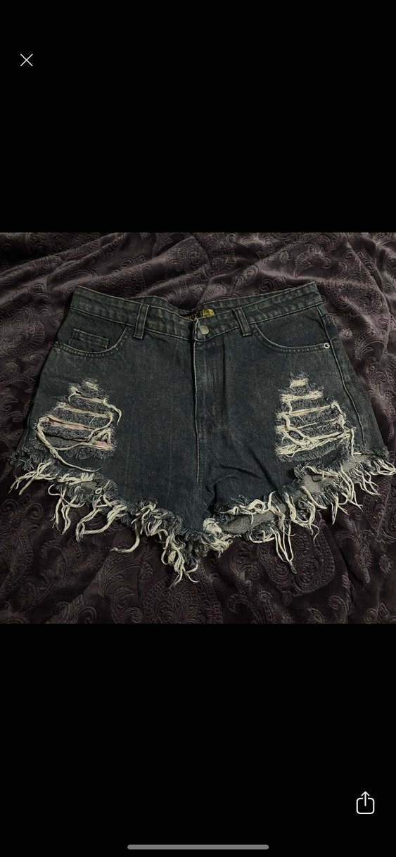 Düğmeli, siyah bağlama desenli kot şort, bol kesim ve yıpranmış detaylarla grunge punk tarzını yansıtıyor.