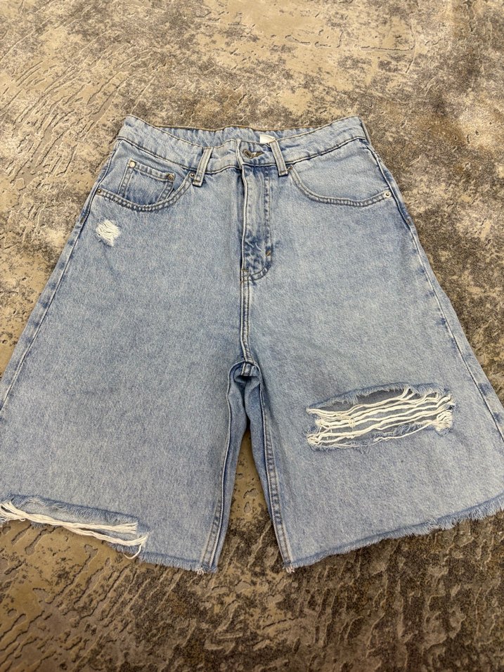 Yırtık detaylı, bol kesim kot şort. Rahat ve sokak stiline uygun tasarım, günlük kullanım için ideal.