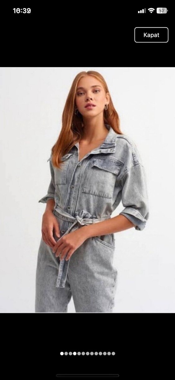 Gri kot tulum, yakalı ve uzun kollu, batik desenli. Bol kesim, kemerli ve midi boyda, gündelik kullanıma uygun.
