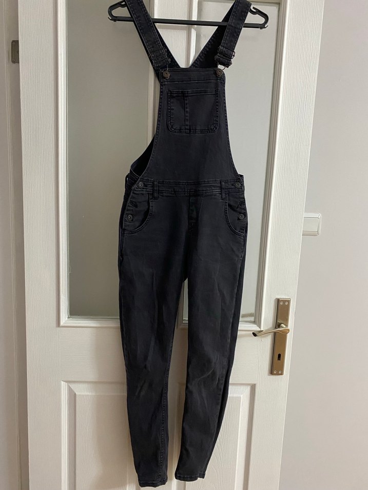 Siyah, ince kesim kot tulum. Askıları tokalı ve ince, yüksek yakalı. -S bedendir -Koton markadır