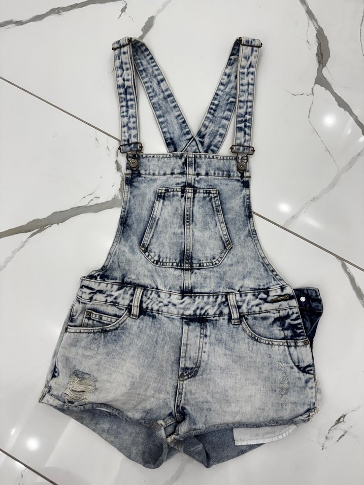 kot tulum, bağcıklı askılı ve gri-mavi batik desenli, sokak tarzı için uygun dar kesim. Geçme yerinde sıkıntı var kullanıma engel değil