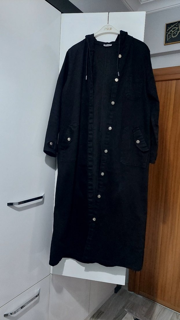kapişonlu siyah uzun kot kumaştır hiç bir yerinde deforme ve solma yoktur dar kesimdir 42 bedene uygundur