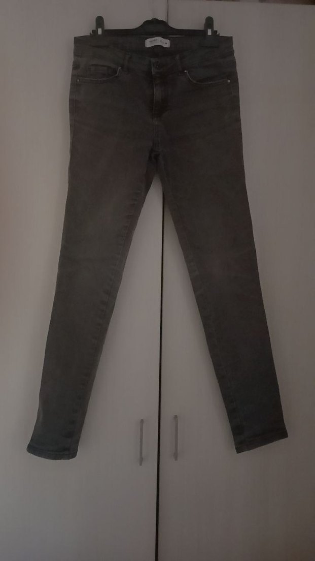 Gri renkli, slim fit kesim ve midi boyda kadın denim pantolon, günlük kullanım için uygun, minimalist ve normcore tarzda.