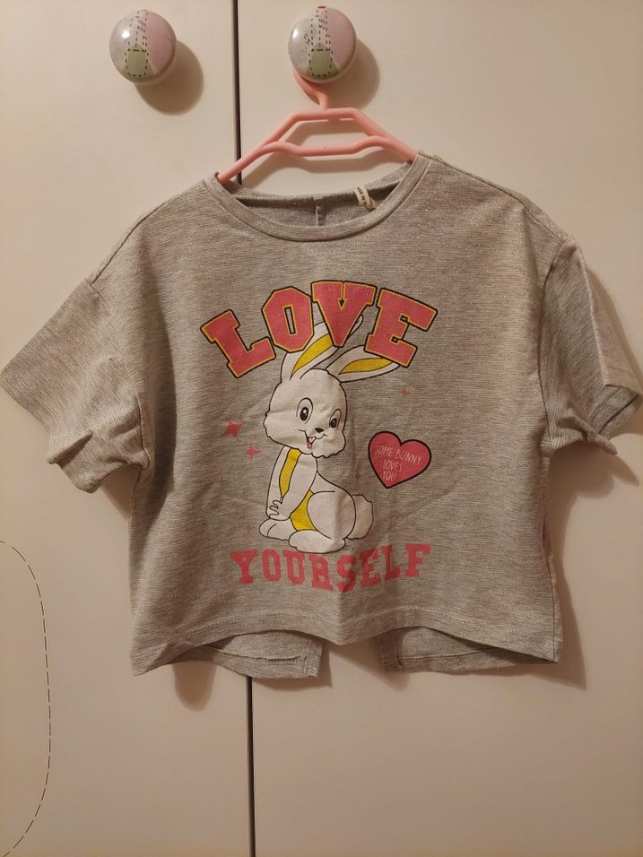 Koton marka, 4-5 Yaş, Gri renkli, pamuklu, simli kumaştan yapılmış, salaş kesim ve yuvarlak yaka kız çocuk tişörtüdür. Tavşan baskısı ve "LOVE YOURSELF" yazısı bulunur. Sırtında yırtmaç detayı mevcuttur.