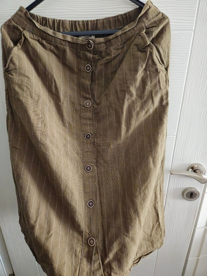 Sorunsuzdur, göründüğü gibi. Koton 42 beden, düğmeli, bol kesim bej keten kadın etek. İsteyenlerle ölçüler paylaşılır.