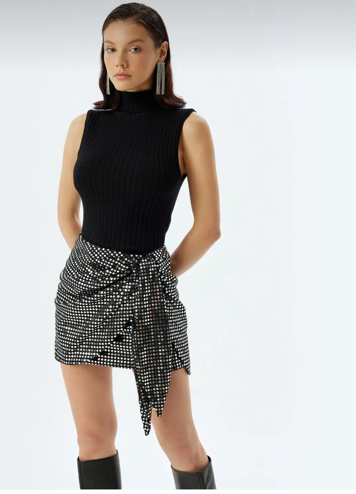 Mini pullu payetli asimetrik kesim bağlama detaylı etek. Polyester, S beden, siyah renk.