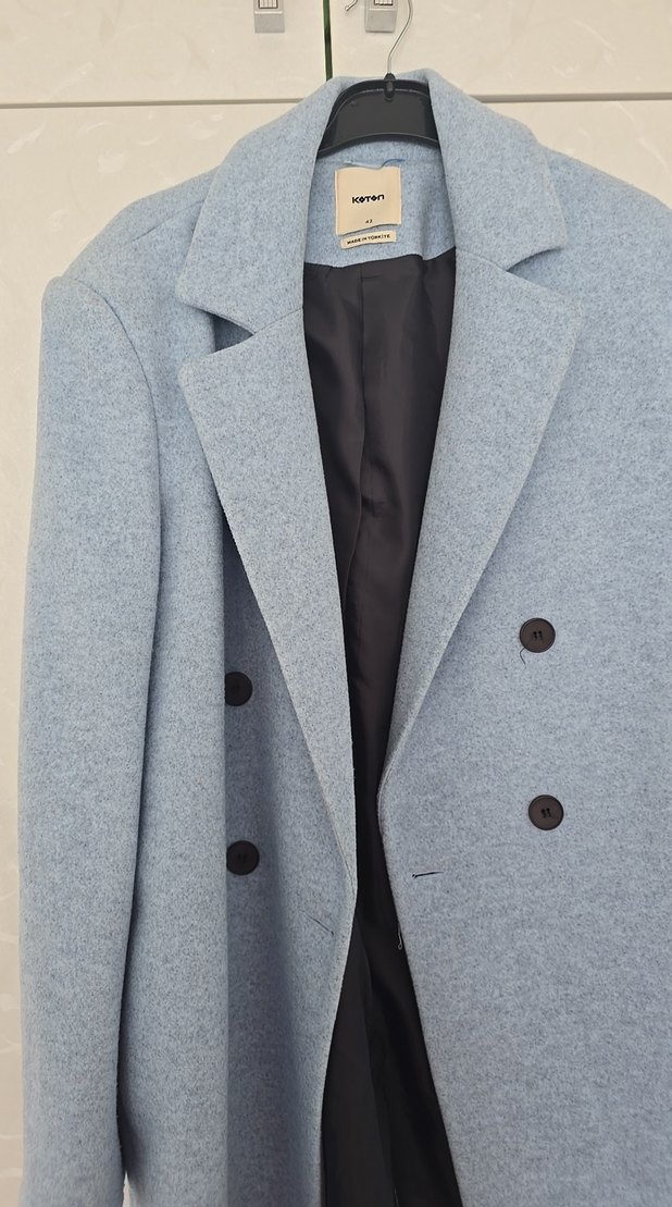 Koton markasına ait açık mavi renkli, çift düğmeli ve astarlı klasik kesim kaban.