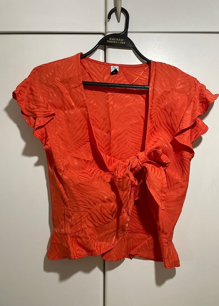 Koton Arzu Sabancı önü bağlamalı bluz bazı yerlerinde hafif tüylenme olmuş kumaş yapısı gereği ama üstte belli olmuyor, m beden nar çiçeği rengi