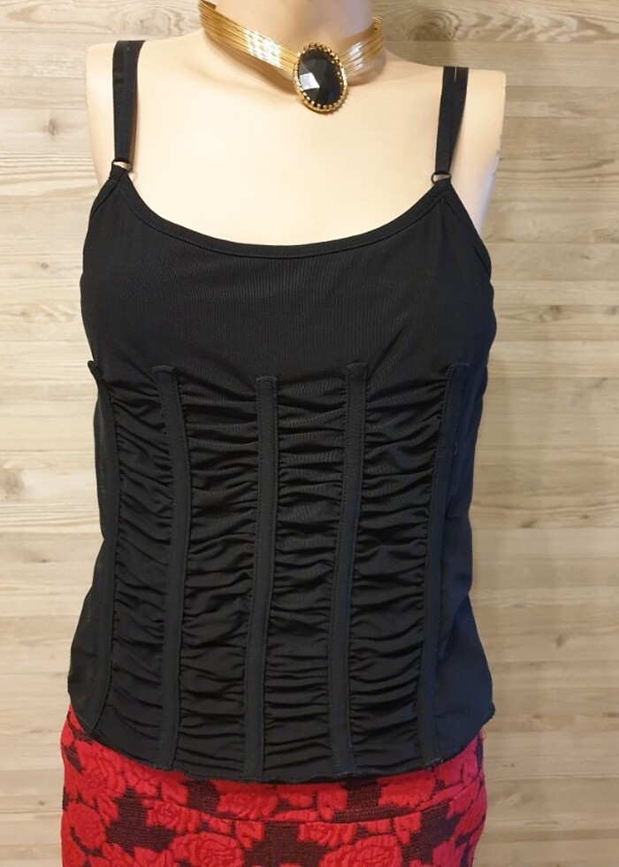 Koton siyah askılı likralı bluz,az ve temiz kullanıldı temizlendi paketlendi,önü astarlı arkası likralı polyester, 90% polyester-10% elastan, - Göğüs çevresi koltuk altından: 80 cm. - Bel çevresi: 76 cm. - Boy omuzdan aşağı: 50 cm.