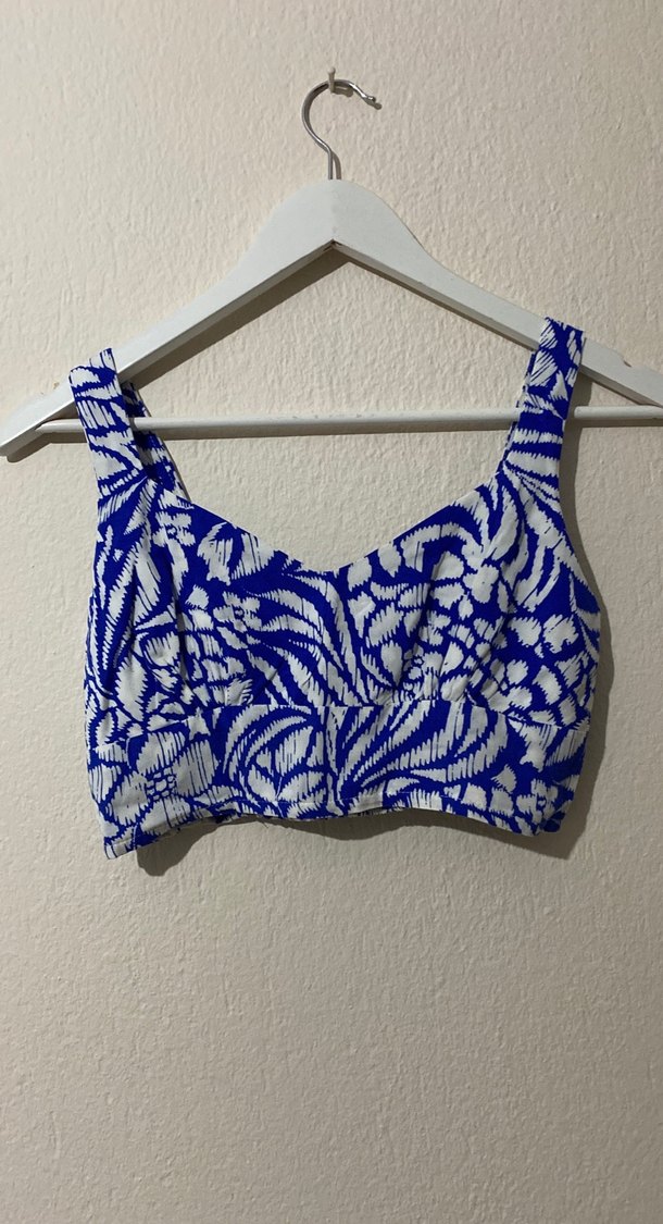 Mavi, bağlama desenli, dantelli, kısa ve bohem stilde, tekne yaka ve askılı bustiyer, dış mekan için uygundur.