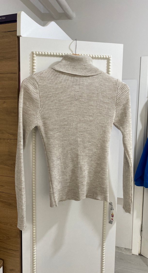 Bej renkli, balıkçı yaka, uzun kollu ve vücuda oturan midi uzunlukta triko kazak. Günlük sokak stili için uygun.