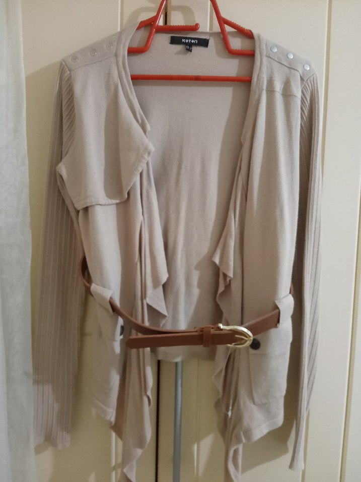 Koton bej renk kemerli hırka sayılı ve temiz kullandım sorunu kusuru yok kemeri kendim koydum ekstra ama bu şekilde satışta L beden fakat dar kalıp M daha çok hitap ediyor
