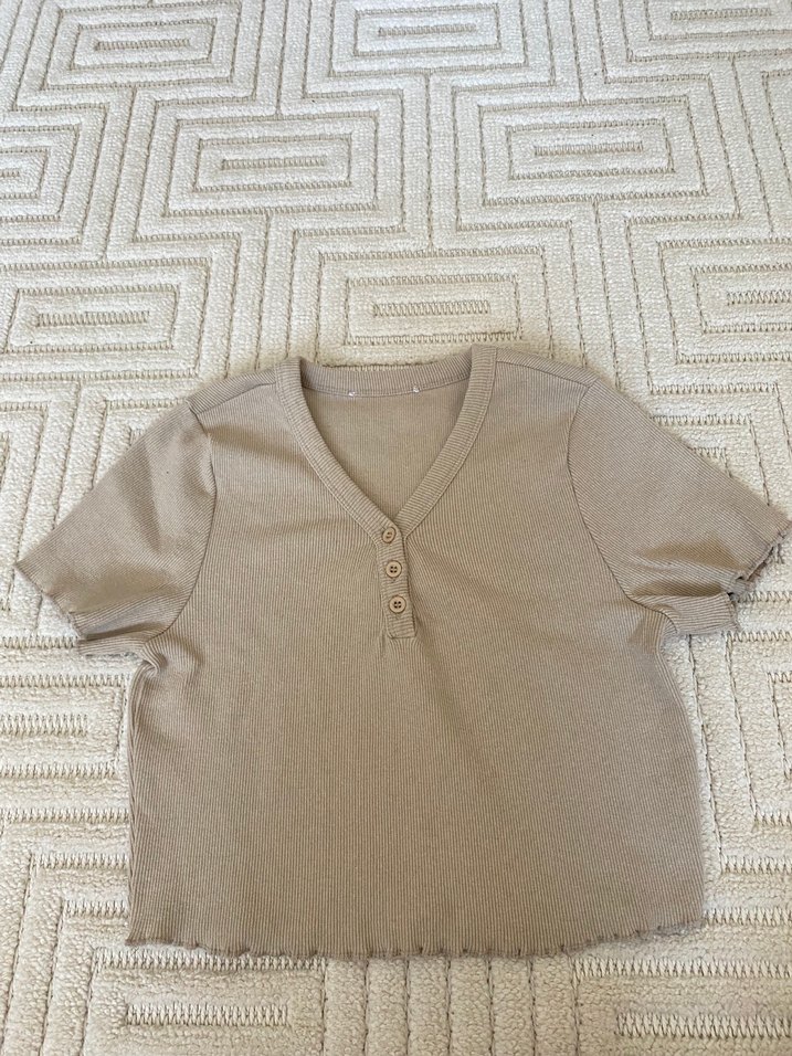 Bej keten, kısa kollu ve düğmeli V yakalıdır. Rahat kesimi ve normal boyu ile günlük kullanıma uygundur.