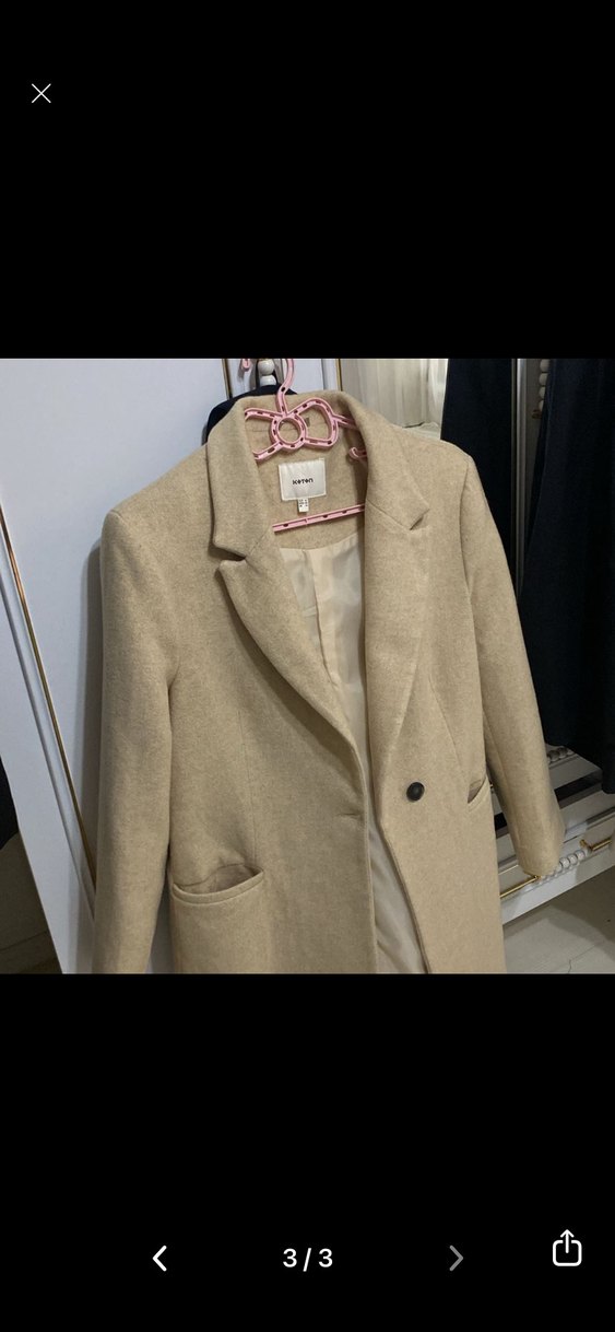 Bej renkte, tek düğmeli, iki cepli, astarlı klasik kesim kaban.