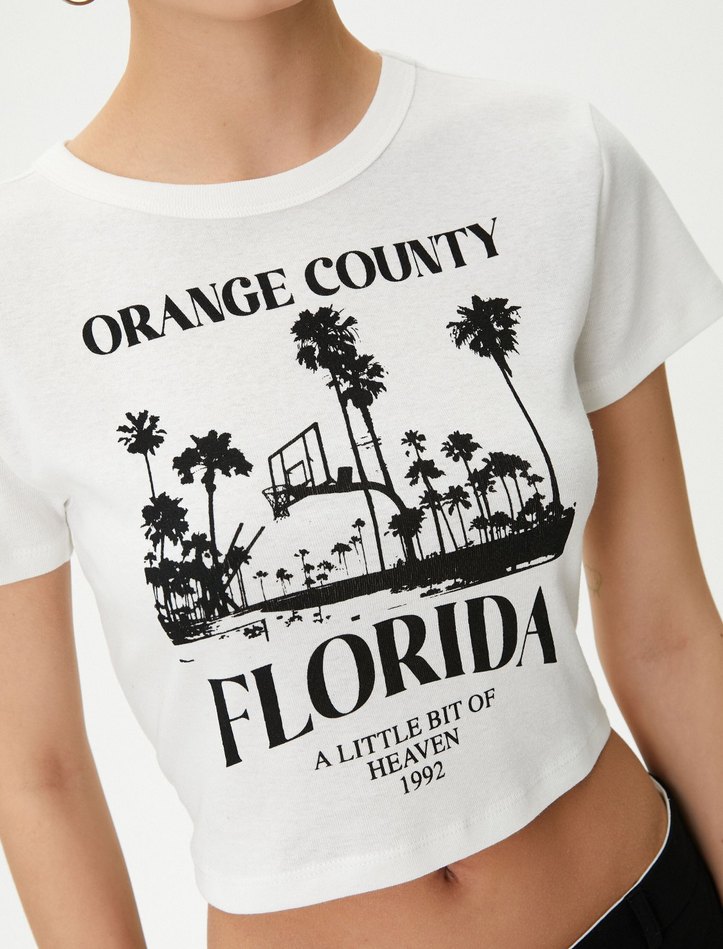 Beyaz crop tişört, kısa kollu ve yuvarlak yaka. Baskılı tasarımda palmiyeler, basket potası ve "Orange County Florida 1992" yazısı var. Pamuklu ve bol kesim.